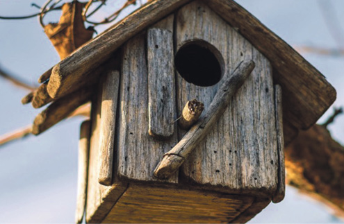 En stor foret fuglekasse er et godt alternativ til naturlige boliger i gamle træer. Vælg eksempelvis en uglekasse. Heri lægger du dødt organisk materiale som træsmulder. Sæt en lille plade for noget af indgangen, så vil kassen danne et godt ly for småfugle og insekter – og måske endda et egern.