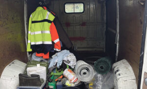 Peter Rasmussen har fyldt bilen med blandt andet trådhegn, ståltråd, økser, kedeldragter, 60-80 par nye strømper og 30 par vanter.