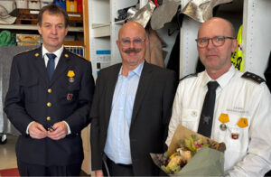Beredskabschef i Lejre Kommune, Frank Praefke, og borgmester i samme, Mikael Ralf Larsen, med John Andersen, der fik et egeløv for 40 års tro tjeneste. Foto: Lejre Kommune