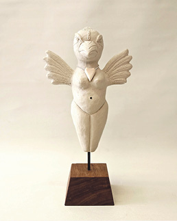 – Jeg har arbejdet en del i bronze, og jeg holder af runde, bløde former og arbejder meget med hvalrossen og kvinden/Fuglekvinden som motiv. Ofte kombinerer jeg materialerne så hvalrossen får tænder af hvalrostand og kvinderne smykker af mammuttand, og jeg bruger i det hele taget ofte tand i dekorationen på mine bronze- og keramiske arbejder. De senere år har jeg modelleret en del store krukker, fortsætter Lene Jensen.