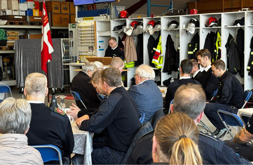 Både beredskabschef Frank Praefke, borgmester Mikael Ralf Larsen og medarbejderrepræsentant Flemming Nielsen holdt taler til forsamlingen.